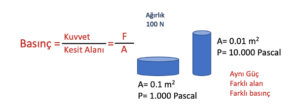 Yukarıdaki şekilde görüleceği gibi kuvvet uygulanan alan ile basınç arasında bir ters ilişki mevcut. Ayni miktar kuvvet alan daraldıkça daha çok basınç üretiyor. Buradan şunu çıkartabiliriz. Namlu çapı daraldıkça ayni miktar barut ile daha yüksek basınç ortaya çıkmaktadır.