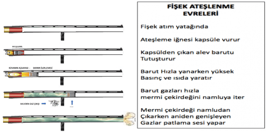 Tetik çekilip, horozun iğneye vurması, iğnenin kapsüle çarpması, kapsüldeki basınca duyarlı kimyasalın (fulminat, bkz kapsül) ateşlenmesi ile sonuçlanır. Kapsülden çıkan alev barutu ateşler. Barutun hızla yanması ile yüksek basınçlı gazlar oluşur. Barutun yanması genellikle saniyenin binde 1-2 si kadar bir sürede olur.