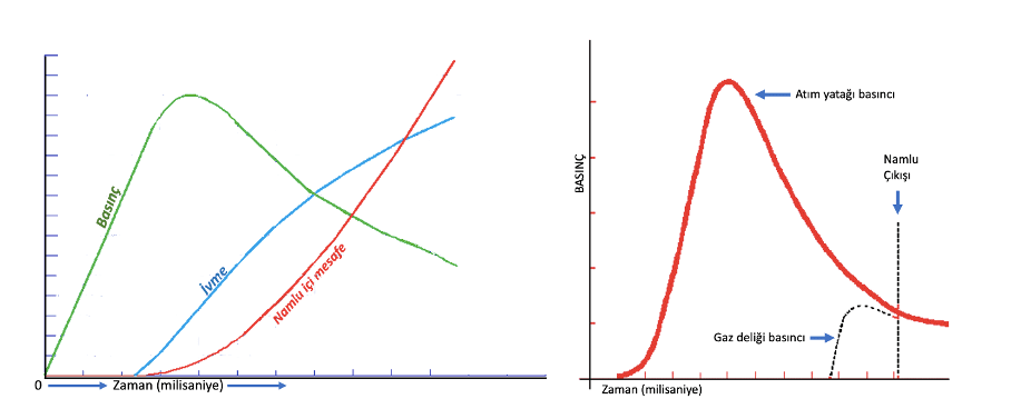 Barutun yanarak yüksek ısı ve gaza dönüşmesi atım yatağında yer alan kovan içindeki dar alanda kimyadaki gaz yasaları, Boyle yasası (P1.V1=P2.V2) uyarınca ısınan gazların hacmının daha da artması ile süratle basıncın yükselmesine sebep olur. Yüksek basınçlı gazlar önündeki tapanın ağzının açılması ve yükün hareket etmesine kadarki sürede basıncını arttırmaya devam eder. Yük namluda ilerlemeye başlayınca Boyle yasasına uyarak basınç düşmeye bu arada öndeki yük (tapa ve sıkı) ivme kazanarak ilerlemeye başlar. Bu olay namlu çıkışına kadar devam eder.
