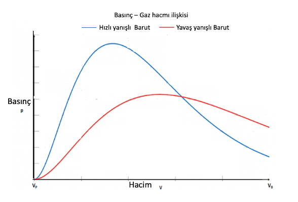 İdeal gaz yasasına göre çıkan gazın hacmı V = nRT / p formülü ile hesaplanabilir. (V gazın işgal ettiği ortamın hacmı, n = mol değerinde gaz miktarı R= Sabit, T=ısı, p= basınç). Bu formüle göre yanma başladığında atım yatağı hacmı sabit olduğudan basınç yüksektir. Yeni gaz üretmediğimize göre, sıkının ilerlemesi ile hacım artacağından basınç dramatik bir şekilde düşecektir.