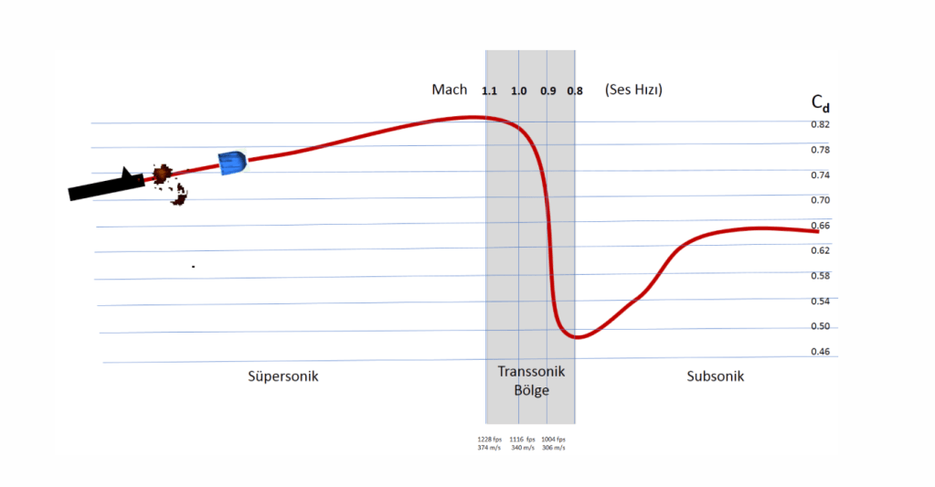 Sesüstü hızda namludan çıkan mermi şiddetli ve artan bir hava direnci ile karşılaşarak yavaşlamaya başlıyor, şekilde izleyeceğiniz gibi mermi hızı ses hızına gelince aniden sürüklenme katsayısında (Drag) bir azalma oluyor, sürüklenme katsayısı süratle düşerken ses altı hıza ulaşınca hafif bir şekilde artış gösteriyor. İşte Mach 1.1 ile 0.8 hızları arasındaki bölgeye ( ortalama 1116 fps / 340 m/s) transsonik bölge adını veriyoruz.