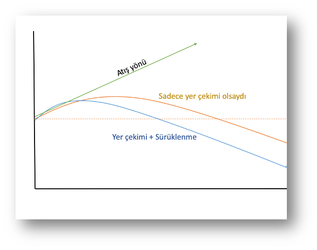 Oysaki hem yer çekimi etkisi, hem de içinde seyrettiği hava direnci ve sürtünmesi ile birlikte daha çabuk hız kaybederek, daha erken düşmeye başlar.