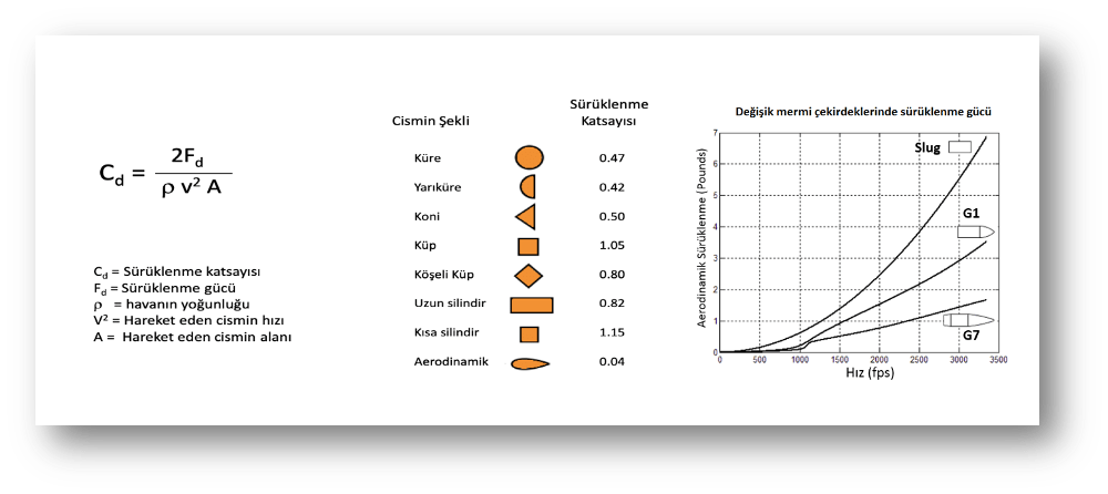 Cismin sürüklenme katsayısı ne kadar küçükse, havada seyri esnasında karşılaşacağı direnç o kadar az olacaktır. Örneğin tapasıyla seyreden tek kurşunlar (uzun silindir), tapasız seyredenlere (kısa silindir) göre daha az hava direnci ile karşılaşır. Yivsiz tek kurşunlar, daha aerodinamik yapıya sahip G1 ve G7 formundaki yivli kurşunlara göre daha fazla sürüklenme gücüne maruz kalırlar.