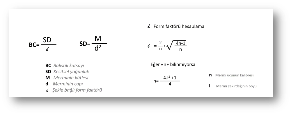 Balistik katsayı, kesitsel yoğunluğun (SD) merminin şekline bağlı form faktörüne (i) bölünmesi ile elde edilen sayıdır. Kesitsel yoğunluk (SD) ise merminin ağırlığının (M) çapının karesine (d2) bölünmesi ile elde edilir. Form faktörü de bazı formüllerle hesaplanabilirse de her zaman doğru sonuç vermeyebilir. Yivsiz tekkurşunlar için form faktörü genellikle 1 kabul edildiğinden BC=SD olur.