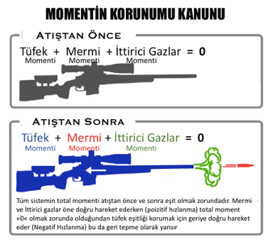 Tüfeğin ağırlığı arttıkça tepme azalırken, diğer faktörler arttıkça geri tepme artar. Newton’un 2. yasası (momentin korunumu yasası)na göre, aşağıdaki resimde göreceğiniz gibi, ateş edilmemiş tüfekte Tüfek+Barut gazı+ mermi’nin toplam momenti SIFIR dır. Momentin korunumu kanununa göre ateşlendikten sonra momentin korunması (0 olması) için, mermi ve barut gazı bir tarafa itilirken tüfek diğer tarafa itilir ki biz buna geri tepme diyoruz
