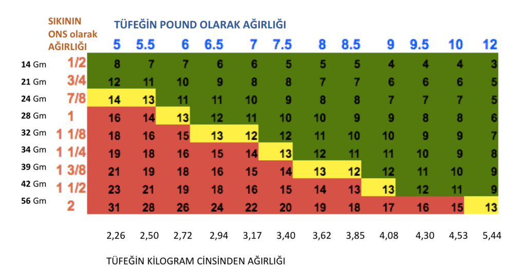 Tüfeğinizin ağırlığını biliyorsanız yukarıdaki tablodan sizi rahatsız etmeyecek geri tepme ve sıkı ağırlığını bulabilirsiniz. Yani tüfeğinizin ağırlığına uygun fişek gramajının altında attığınız fişekler geri tepme açısından sizi rahatsız etmeyecektir.