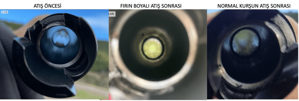 Fırın Boyalı 10 adet kurşun atışı sonrası Birleştirme konisi önünde namlu içine bakarsanız (ortada) pek bir kirlenme olmadığı görülüyor. Oysaki sağda 10 adet kaplanmamış normal kurşun atışından sonra namluda belirgin kurşun sıvaşığı olduğu görülüyor. Bu da önceden söylenenleri doğruluyor.