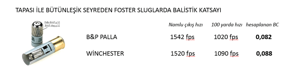 Tapasız seyreden 28 gram Foster sluglar için için SD = 0,081 olarak hesaplamıştık. Form faktörü yivsiz tekkurşunlar için 1 kabul edildiği için BC = 0,081 olurdu. Oysaki atış yapılarak bulunan değerlerle hesaplandığında bu öyle çıkmıyor. Firmaların kendi sitelerindeki balistik tablolardaki değerlerle hesaplarsak: