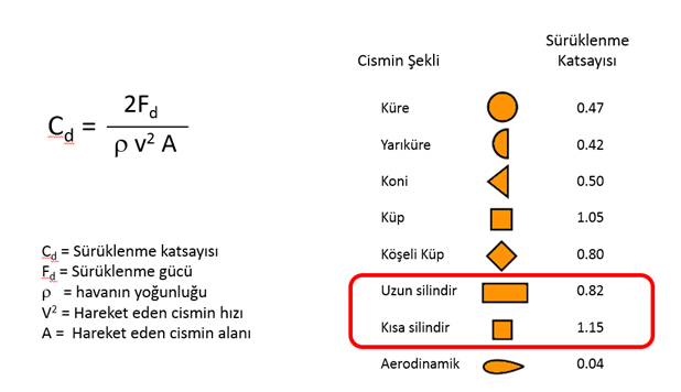 Bunun nedenini kısa silindir ve uzun silindir yapısında olan cisimlerin sürüklenme katsayılarında bulabiliriz: