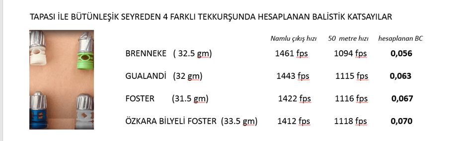 Değerler biri birine yakın görünse de En düşük BC daha künt uçlu Brenneke, en iyi BC Fosterlerde hesaplandı. Tevfik Gün’de uzun mesafeli yivsiz tek kurşun atışlarında en iyi isabet sonuçlarının Foster tipi kurşunlarla olduğunu ifade ediyor. Ayrıca daha önceki yazılarımda belirttiğim gibi Setleri mermi ucuna kadar uzanan rifled slug türü tek kurşunlarda (Brenneke) asimetrik ezilmeye bağlı alfa açısı ve uzak hedeflerde geniş grup yapması bir sorun. Ayrıca düşük BC leri nedeniyle diğerlerinden daha kısa mesafede transsonik etkiye giriyorlar.