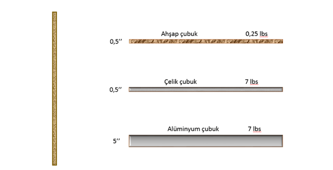Ayni boyda ahşap, çelik ve alüminyum çubuklar alalım. Ahşap ve çelik çubuklar ayni çapta, çelik ve alüminyum çubuklar ayni ağırlıkta olsun. (Örnek emperyal ölçülerle alınmıştır). Yoğunlukları nedeniyle aynı uzunluktaki ahşap çubuk 0,25 libre iken çelik çubuk 7 libredir. Yine boyutları ve ağırlıkları ayni olan alüminyum çubuğun çapı artacaktır. Şimdi bunların kesitsel yoğunluğunu hesaplayalım. (Emperyal ölçüde ağırlık grain, çap inç olarak alınır ve çapın karesi 7000 ile çarpılır) SD= m/7000*d2