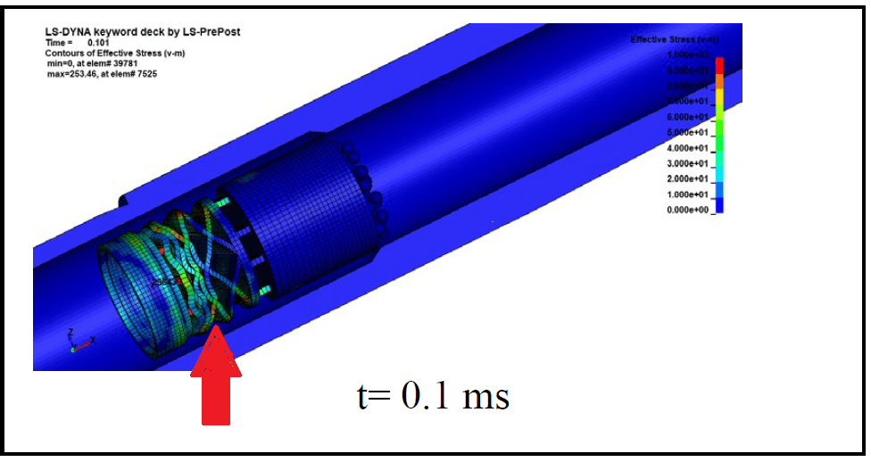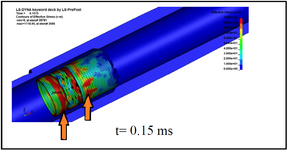 0.15 milisaniyede tapa bacakları tamamen ezlmiş, henüz atım yatağında ama birleştirme konisini geçmeye başlamış. Okla işaretli kırmızı alanlarda basınç çok yüksek. Saçmaların yer aldığı tapanın yüksük kısmı tabanında basınç yüksek buradaki saçmalarda kısmen ezilme olması beklenir