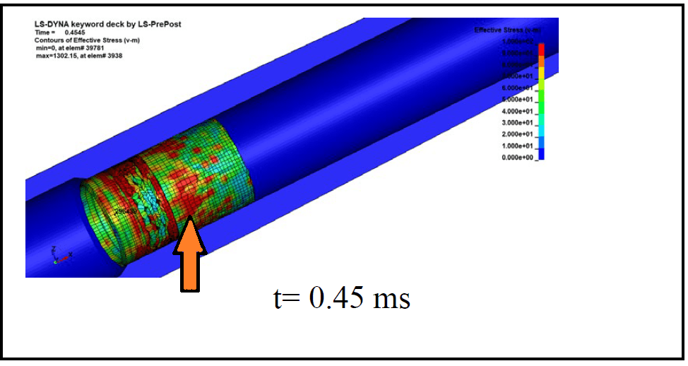 0.45 milisaniyede tapa atım yatağı ve birleştirme konisini geçmiş namluda ilerlemeğe başlamış, Tapa alt kısmında kırmızı alanlar basıncın iyice yükseldiği alanlar, yüksük kısmı tabanında stress oldukça artmış