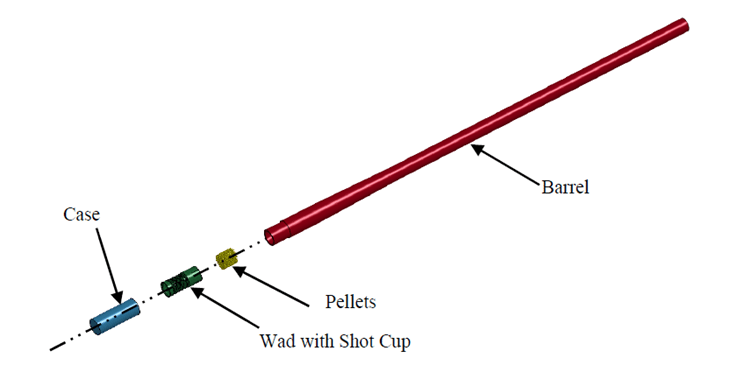 16. Uluslararası LS-DYNA konferansında Deng S, Wang J ve Wu T tarafından sunulan “ The Shotgun Interior Ballistic analysis by Discrete Element Methot (DEM) of LS-DYNA” adlı bildiride yazarlar Katı modelleme ile malzemeleri çizdikten sönra malzeme özelliklerini bilgisayar programına girerek değerlendirmişler: